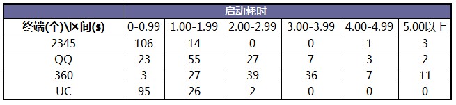 從啟動(dòng)耗時(shí)來(lái)看,2345手機(jī)瀏覽器的啟動(dòng)耗時(shí)區(qū)間大致在0-1.99秒,平均啟動(dòng)耗時(shí)略遜于UC,但遠(yuǎn)遠(yuǎn)優(yōu)于QQ和360的啟動(dòng)耗時(shí)。而且測(cè)試表現(xiàn),2345和UC的啟動(dòng)耗時(shí)在各機(jī)型上表現(xiàn)波動(dòng)不大,非常穩(wěn)定。